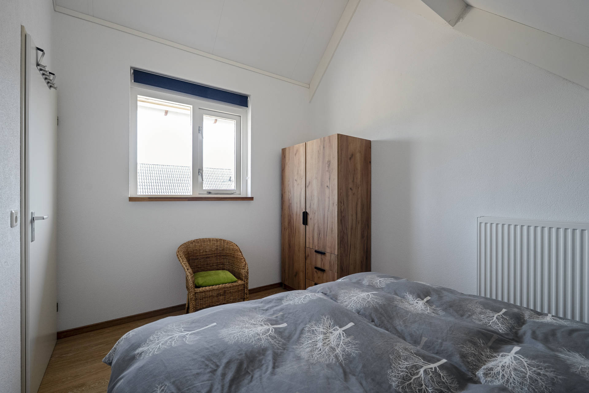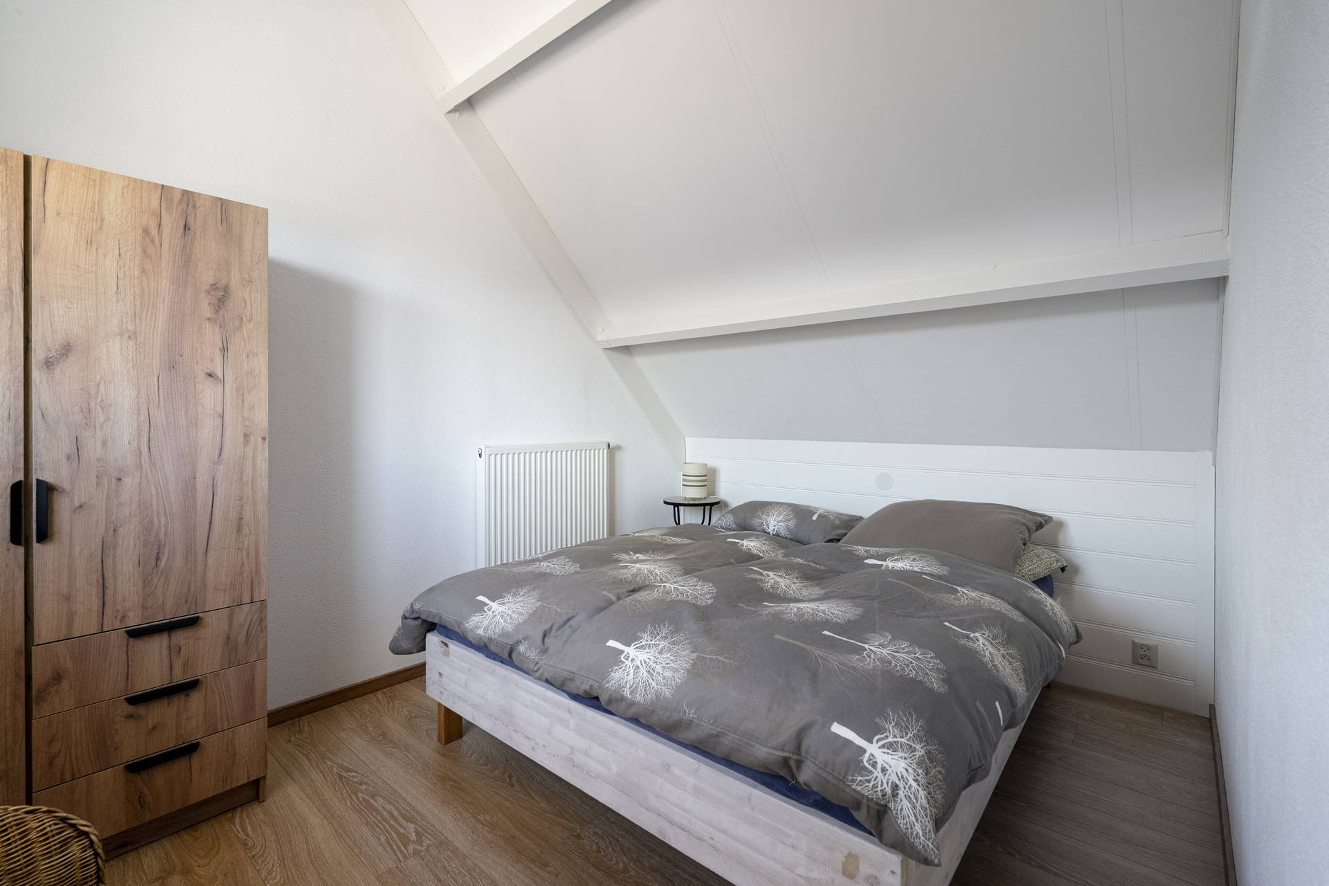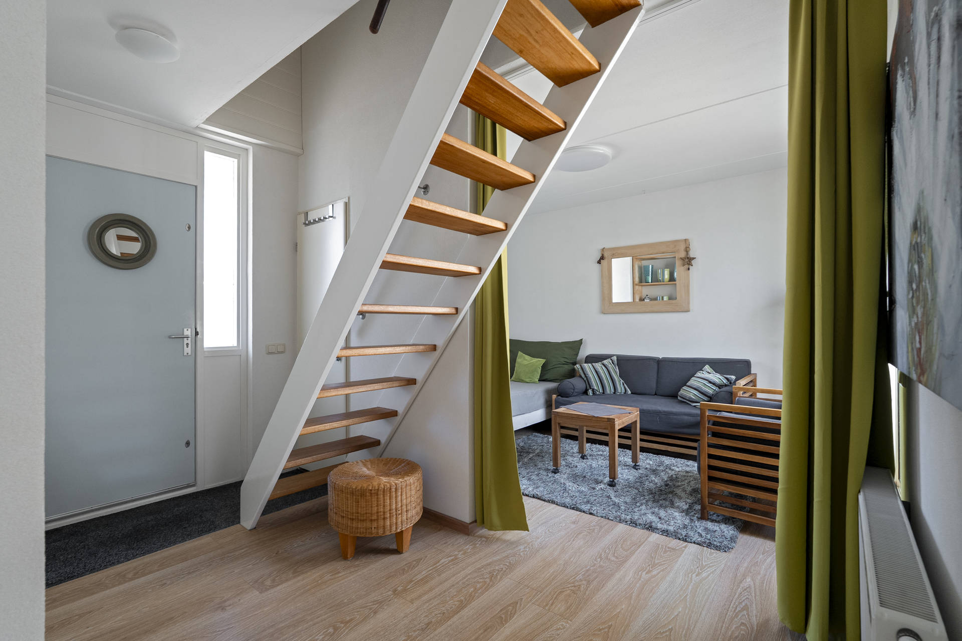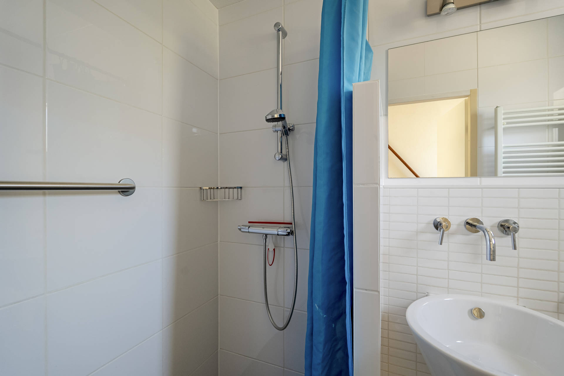 Op de begane grond bevindt zich de badkamer, uitgerust met een inloopdouche, wastafel en toilet. Via de open trap in de woonkamer kom je op de eerste verdieping, waar zich twee slaapkamers bevinden. Beide kamers zijn ingericht met twee eenpersoonsbedden.