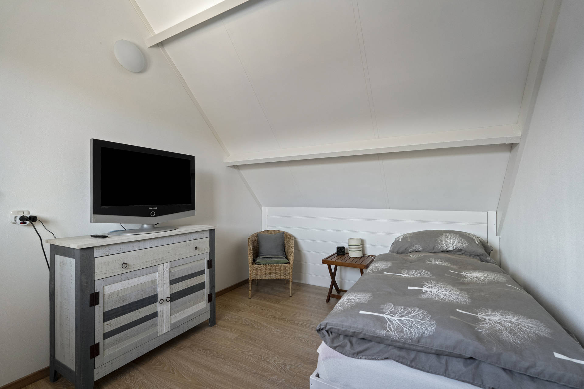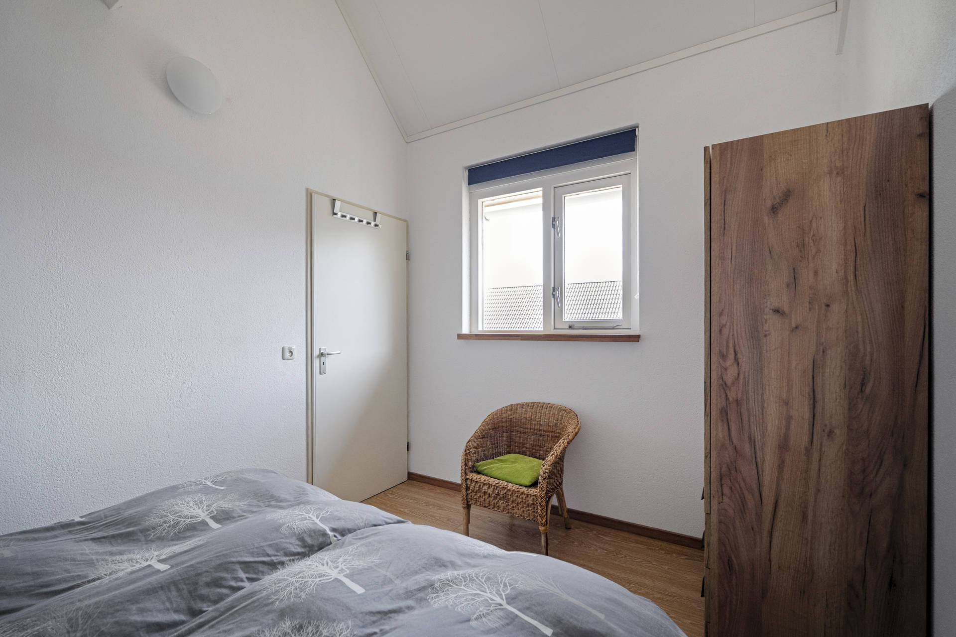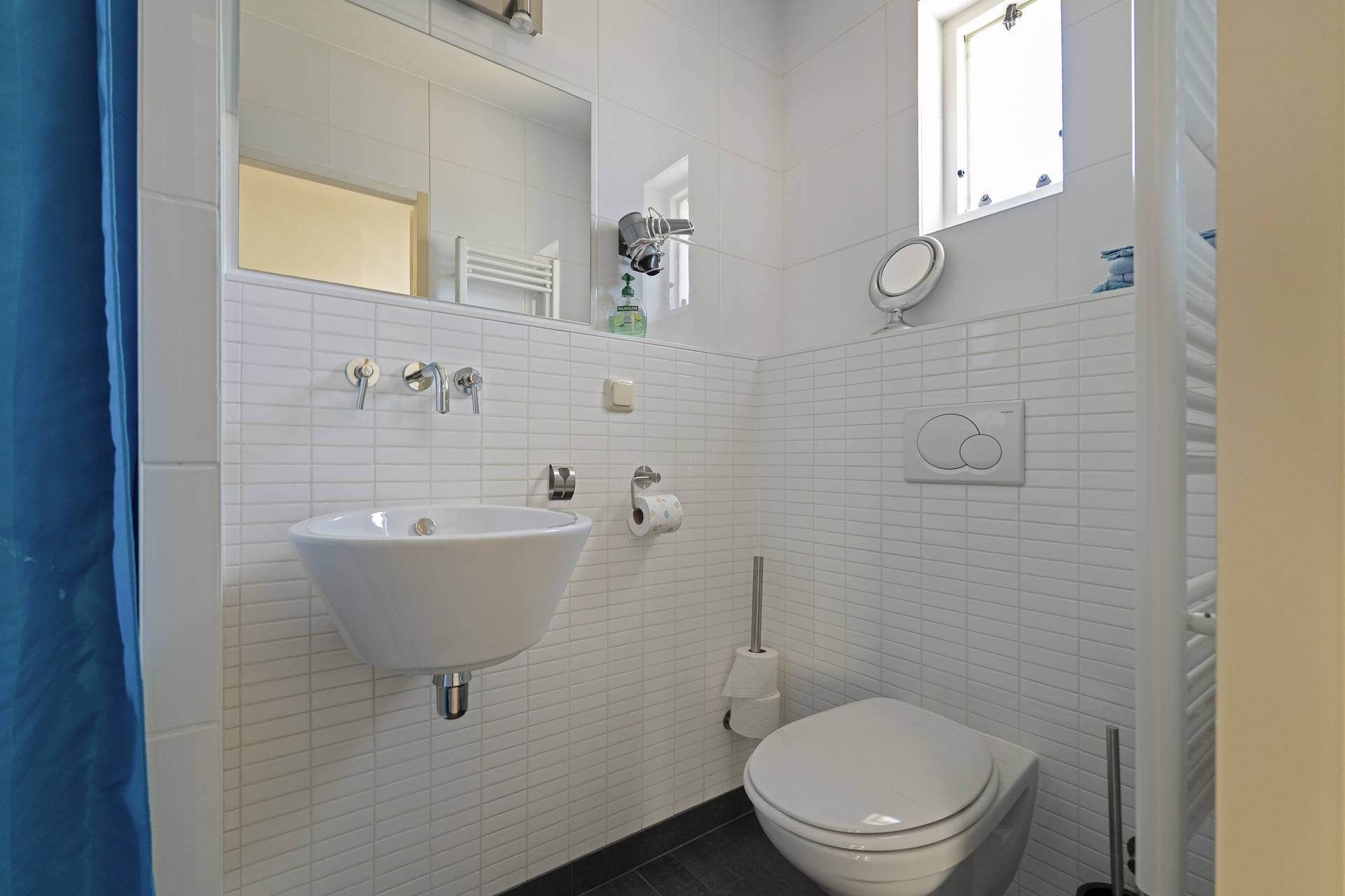 Op de begane grond bevindt zich de badkamer, uitgerust met een inloopdouche, wastafel en toilet. Via de open trap in de woonkamer kom je op de eerste verdieping, waar zich twee slaapkamers bevinden. Beide kamers zijn ingericht met twee eenpersoonsbedden.