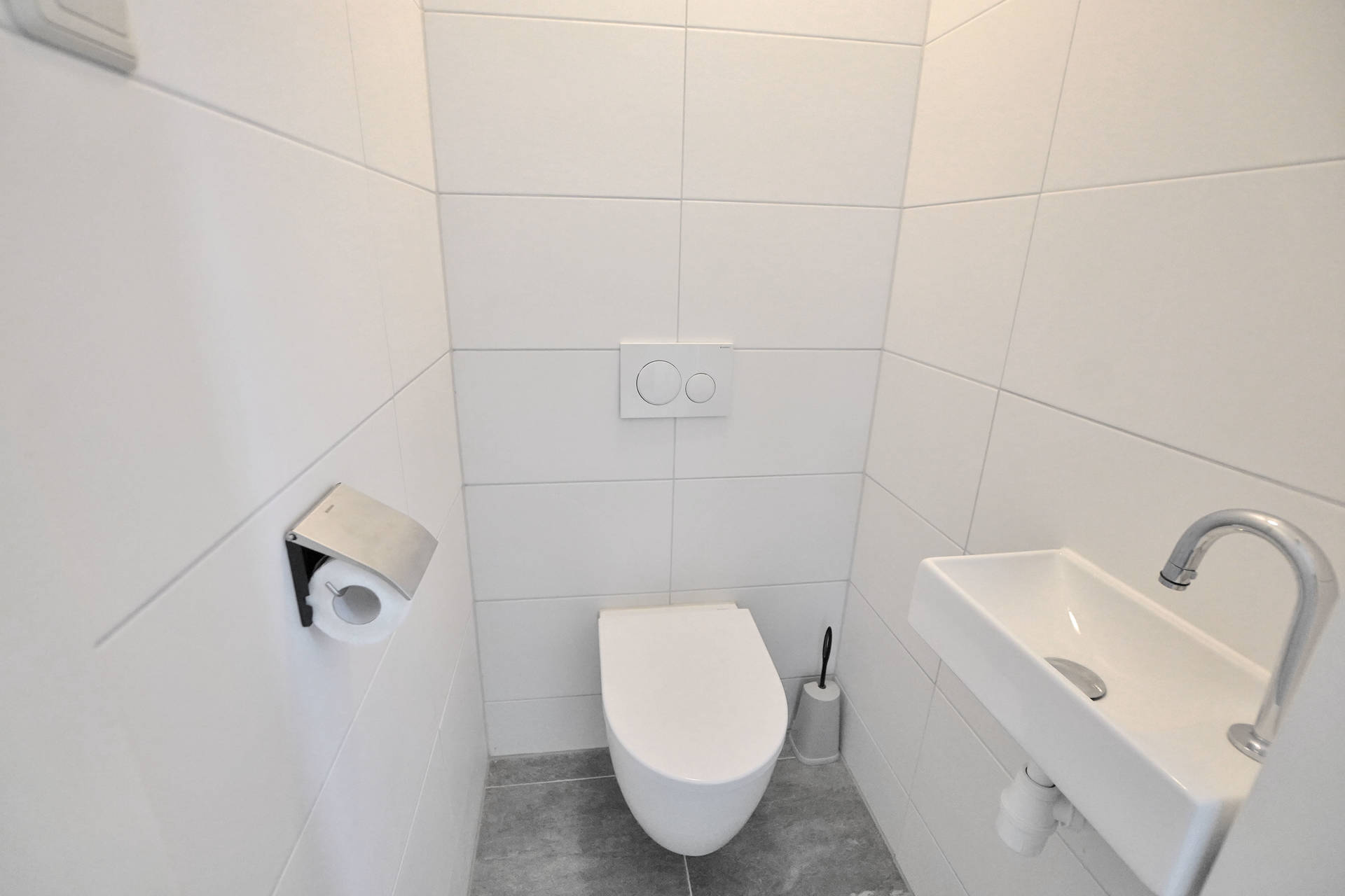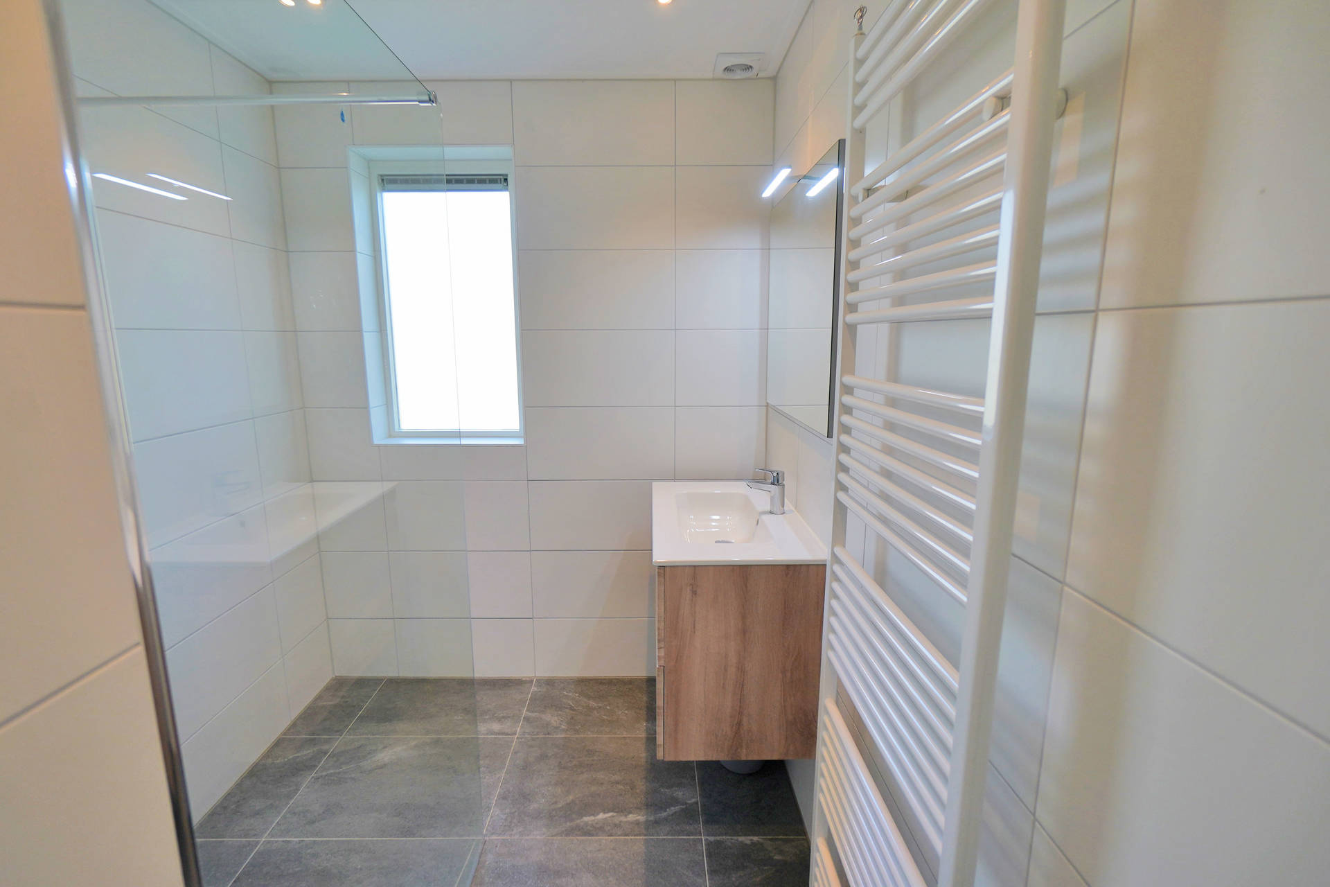 De badkamer met douche en wastafel is op de begane grond, het toilet is apart gesitueerd. Het huis beschikt over een wasmachine en droger, deze staan in de berging.