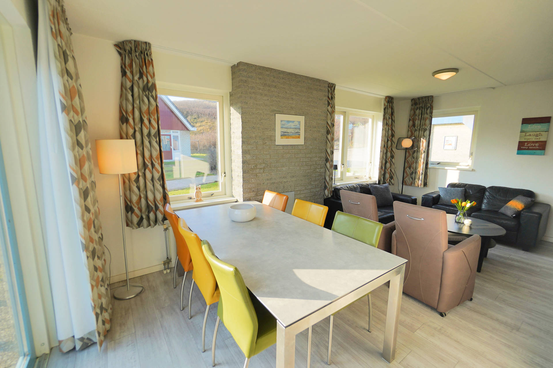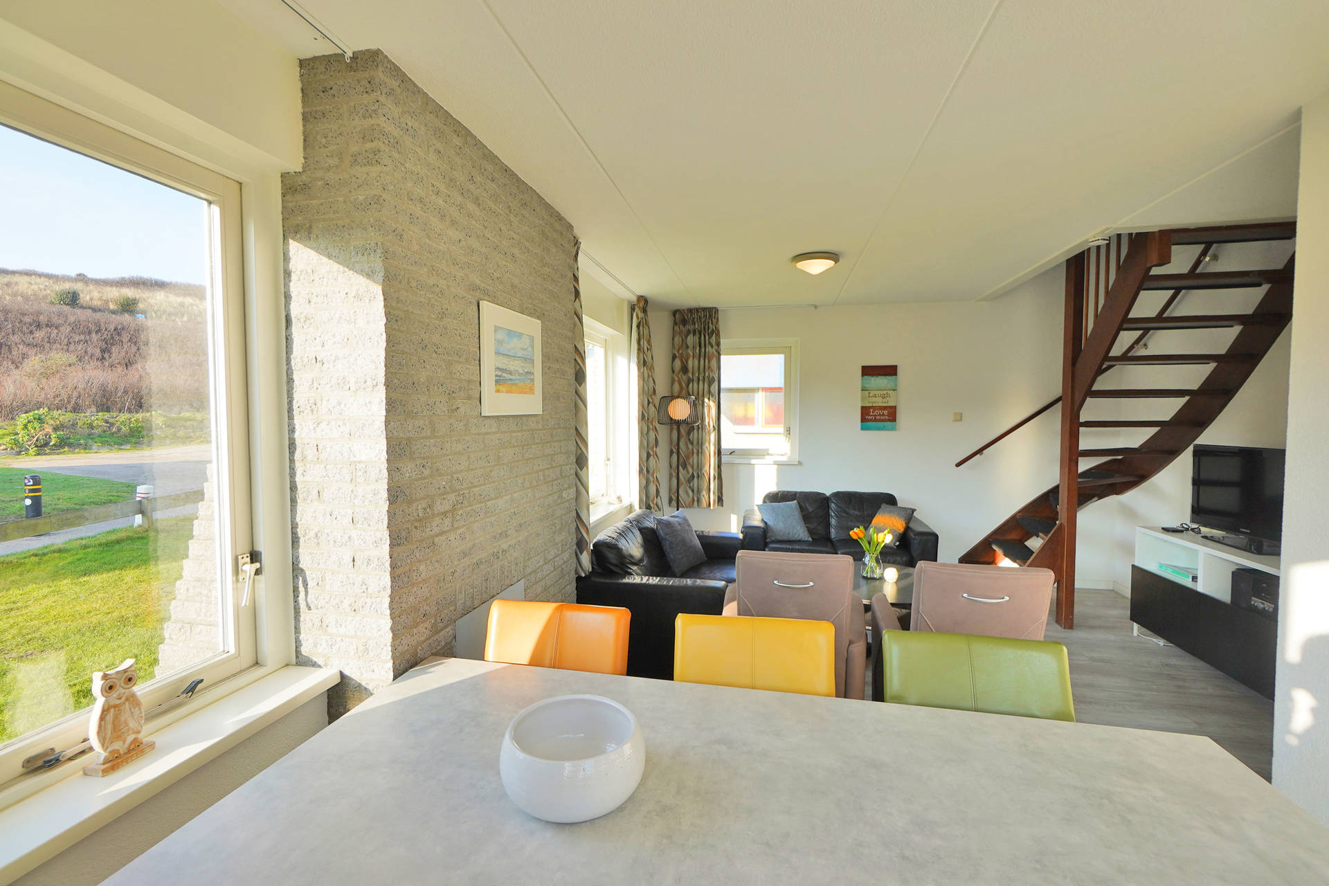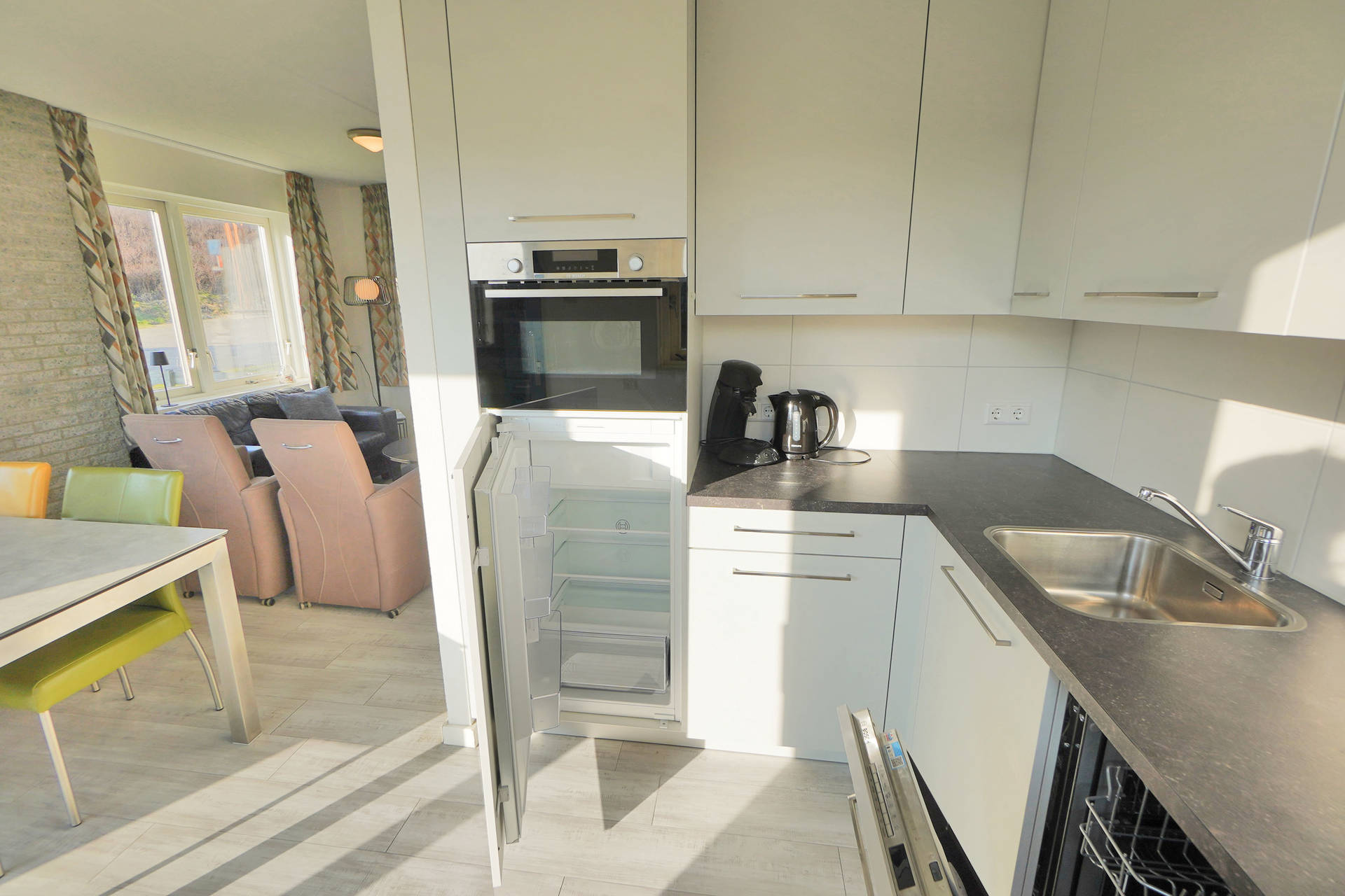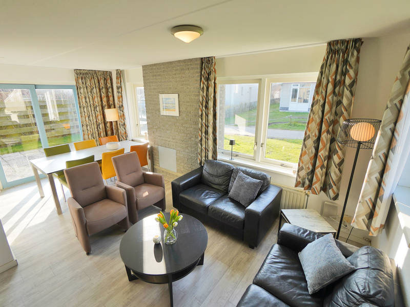 De woonkamer met voldoende zitgelegenheid en kabel tv, bevindt zich aan de voorzijde van het huis en biedt mooi uitzicht op de strandopgang de Seinpost. De woonkamer staat in open verbinding met de eethoek en keuken. De keuken is goed uitgerust en voorzien van koelkast met vriesvak en vaatwasser.